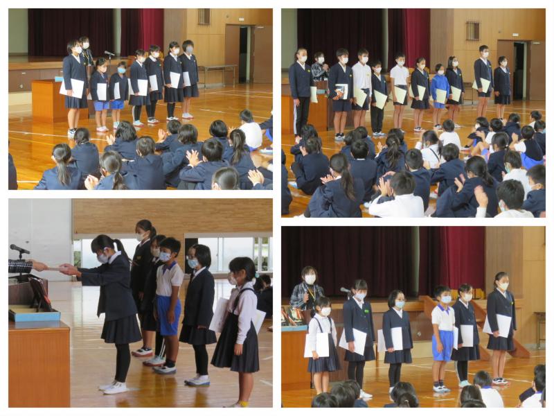 11月11日(木)の5時間目開始前に、賞状伝達式を行いました。今回の表彰者は、喜多こども美術展書写部門(入選以上)、喜多郡読書感想文審査(佳作以上)、喜多郡小学校陸上競技大会(3位以上)です。