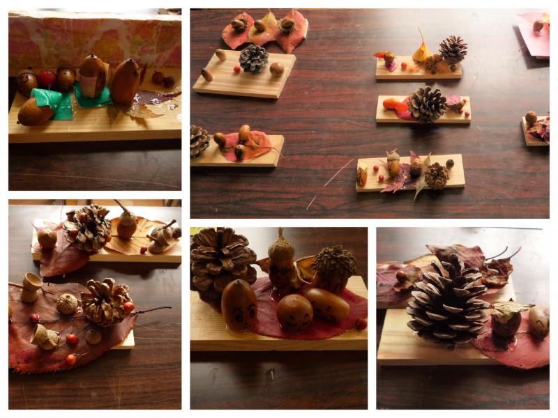 11月12日(金)、1年生が昨日図工で制作していた作品が展示してあるのを発見!どんぐりや木の葉、松ぼっくり等々を使って、とってもかわいくて素敵な作品がたくさん展示してあります。(*^_^*)「芸術の秋!」の言葉にふさわしい素晴らしい作品ばかり。どんぐりや松ぼっくり等々、たくさん集めて協力していただいた保護者の皆様、本当にありがとうございます。