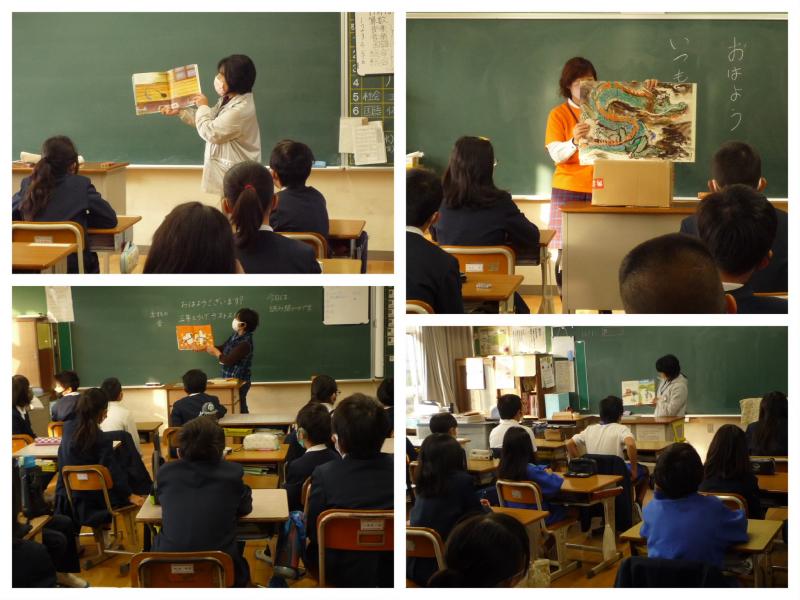 11月18日(木)、今朝は読み聞かせがありました。いつも爽やかな笑顔で学校に来ていただく天天くすのきクラブの皆様方。今日もそれぞれの学年のために選んだ本を読み聞かせしていただいています。