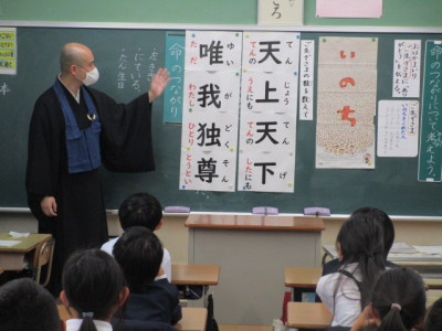 さて、金曜日の3時間目に、道徳の授業で、地域の方にゲストティーチャーとしてお越しいただきました。今回のゲストは、香林寺の住職、有田さんです。「ヌチヌグスージ(いのちのまつり)」という教材を使って命のつながりをテーマに考えました。自分には、両親がいて、そのまた両親にも両親がいて、遡っていくとたくさんの人の命が受け継がれていることに気づきました。授業の後半には、住職の有田さんから、お釈迦様が誕生したときのエピソードをもとに「天上天下 唯我独尊」という言葉を紹介していただき、私たちみんな一人一人が大切な存在であることを教えていただきました。3年生は、授業はもちろん、住職さんのお話にもしっかり耳を傾け、積極的に発表をしていました。子供たちには、今日の授業で感じたことを今後に生かし、自分の命を大切に、そして周りの命も大切にして、楽しく生活してほしいと思います。