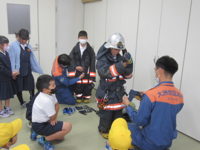 続いて、消防士の格好をさせていただいたり、消防車や救急車に乗せたいただいたり、体験的な学習をさせていただきました。財産や人の命を救う大事な仕事に触れることができ、貴重な学びとなりました。将来、消防士を目指す人が出てくるかもしれませんね。