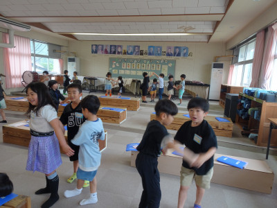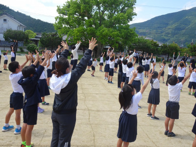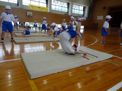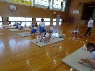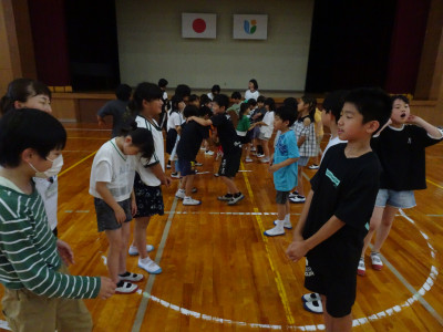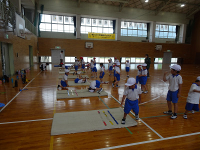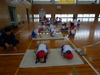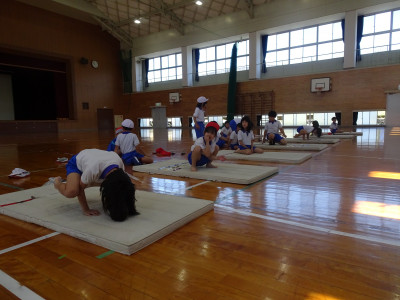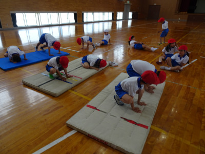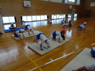 体育館で、ラジオ体操やダンスの練習をがんばっていました。