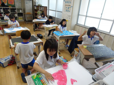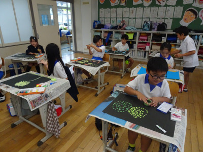 3年生は図工です。秋の絵も仕上がってきましたよ。