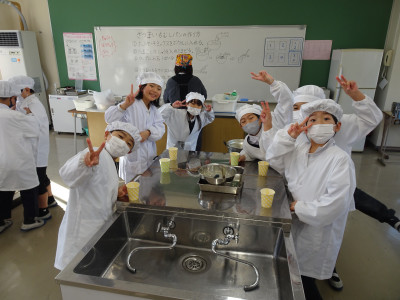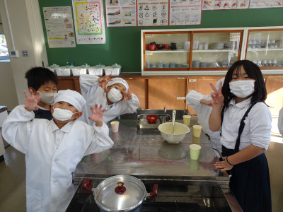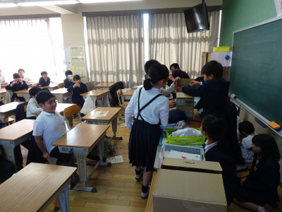 1年生の給食では、6年生がてきぱきと準備をしてくれていました。