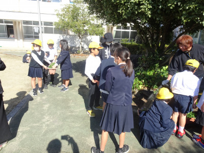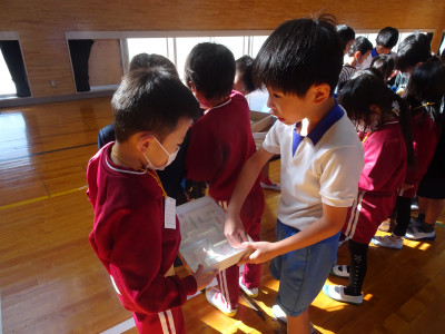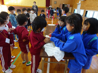 6年生が、1年生の朝の準備の手伝いや給食の準備の手伝いにがんばってくれています。