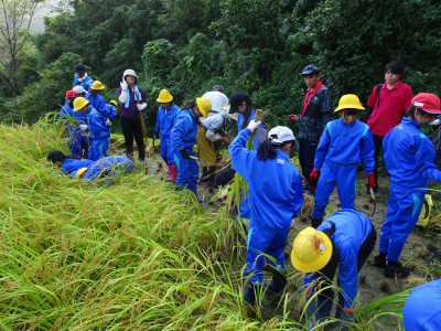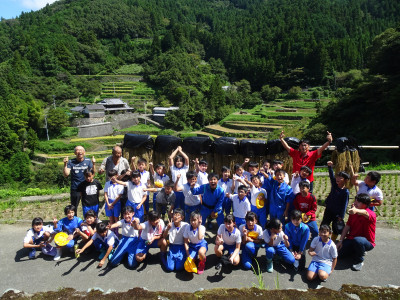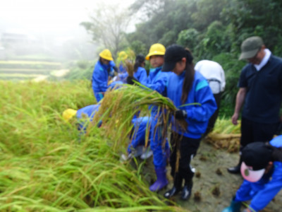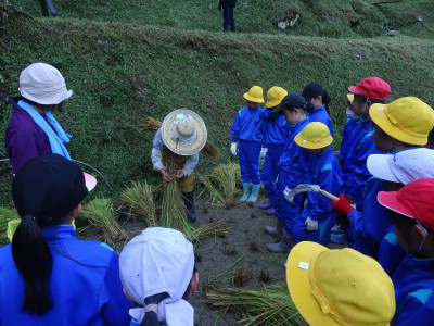 今日は、4年生が、棚田での稲刈り体験をしました。