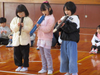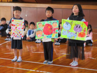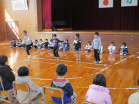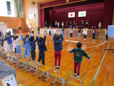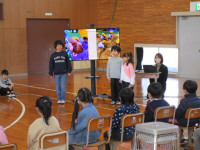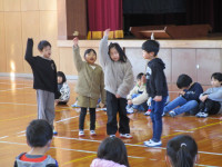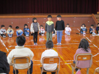 続いて、体育館に移動して1年生が小学校での生活や学習の様子を紹介しました。国語の音読、計算カード、リコーダー、絵画、なわとびを上手に披露することができました。そして、1年生全員で、みんなが大好きな絵本「だるまさんが・・・」を動きで表現しました。新入児も一緒に体を動かし、楽しい交流ができました。子供たちの感想発表の中に、新入児に対して、「(天神小学校に入学したら)何か困ったことがあったらいつでも言ってください!」という力強い言葉もありました。