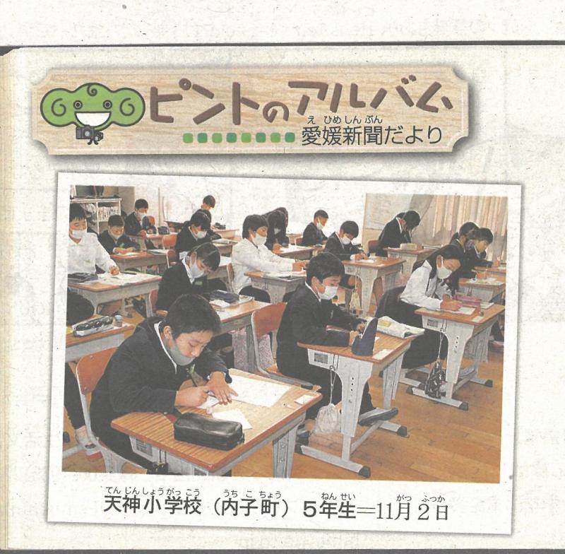 2021年12月20日 13時01分12月19日(日)発行の、ジュニアえひめ新聞(えひめ新聞にはさんであります)5面「ピントのアルバム(愛媛新聞だより)」コーナーに、5年生の写真が出ています。これは、11月2日に本校ホームページで掲載した時、撮影されたものです。