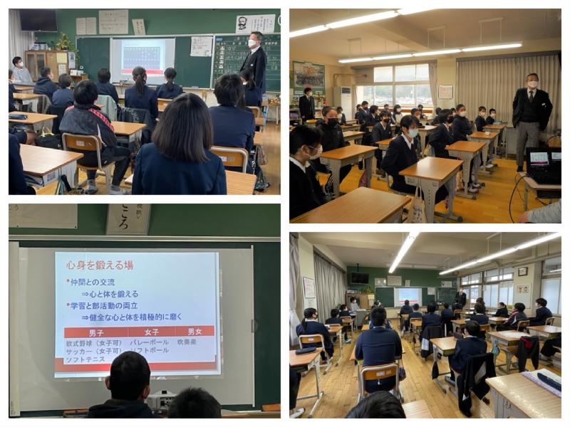 2022年2月8日 15時49分2月8日(火)の4時間目、五十崎中学校の上野教頭先生に来ていただき、6年生に中学校入学説明会を行いました。本当は、本日午後から実際に保護者の方々と一緒に中学校に行って授業の様子を見たり説明を聞いたり、部活動の雰囲気も感じたりできるという「入学説明会」を計画していただいていました。