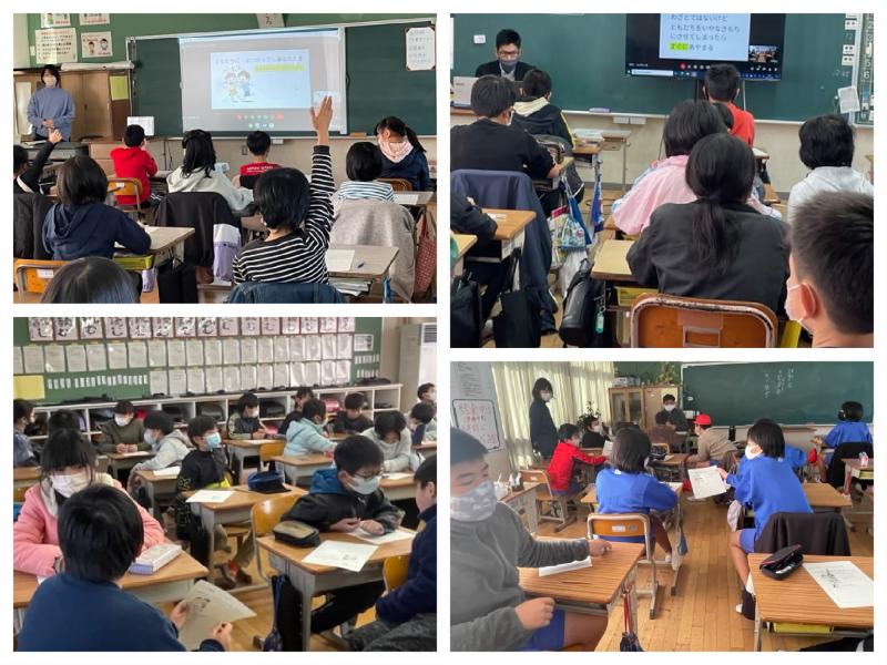 2022年2月9日 14時06分2月9日(水)の天神タイムは、まごころ集会でした。今回は、感染症予防のためオンラインで開催し、学年ごとに各教室で集会に参加しました。大森先生が、「友達とぶつかったときに、なんと言えばいいかな?」と投げかけると、子どもたちは一人一人渡されたプリントに「ごめんなさい。」という言葉を書き込むことができました。また、反対に、「ごめんなさい。」と言われたらなんと返したらいいか、という問いかけに対しては、「気にしないでいいよ。」などの言葉を考え、友達同士で、言葉掛けの練習を行うことができていました。
