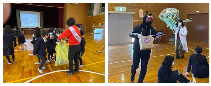 そして、「感染症にかかってしまった天ちゃん」「うがい手洗い調査隊」「感染症のウイルス」が登場し、感染症にかかったときのウイルスの飛散や、使用済みのマスクやティッシュの処理の仕方について子どもたちに具体的に理解してもらおうと、身体を張った演技を披露しました。特に、天ちゃんがくしゃみをする時にウイルスボールが飛散する場面では、実際にウイルスボール(吉岡先生の手作りです)が飛び散ることで、とてもたくさんのウイルスが辺り一面に散らばったり浮遊したりするということがわかったと思います。