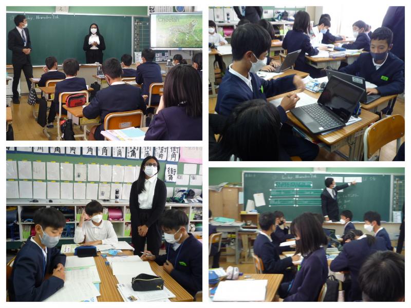 2022年11月8日 16時03分11月8日(火)の4時間目、6年生の外国語科の授業を見に行きました。6年生は、学習発表会に向けて、「地球で暮らす生き物について発表するために、今までに学習したことを使って表現する」学習をしていました。子供たちは、自分で考えた文を友達に紹介し合って、もっと詳しくなるための工夫を考えていました。ALTのパトリシア先生にも助けてもらったり、やり方を見せてもらったりなどする中で、「森の中だから、in the forest って表現するんじゃない?」とか、「得意って、英語でどう表現するんだった?」など、互いに教えたり教えられたりしながらグループで学習を進めることができていました。