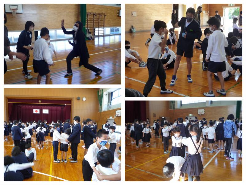2022年11月8日 16時23分11月8日(火)、今日は掃除の時間を天神タイムに変更して、まごころ集会を行いました。まずは、3人組に分かれて「ぴったりじゃんけん」ゲームです。3人組は、みんな違う学年で作ることが条件です。そして、じゃんけんは英語で行います。パトリシア先生と竹内先生がお手本を見せてくれて、いざ開始!"stone paper scissors one two three." の掛け声でじゃんけんをします。3人全員がそろったら座ります。みんな、すごく楽しそうです。このゲームを3回ほど繰り返し、最後の3人組で「木とリス」のゲーム開始。木の役2人、リス役1人で、「オオカミが来たぞ」でリスだけ移動、「木こりが来たぞ」で木が移動、「嵐が来たぞ」で全員が移動します。全てのゲームにパトリシア先生も参加していただきました。ゲームが始まると、みんなすぐに夢中になり、あっという間に時間が過ぎて行きました。(*^_^*)