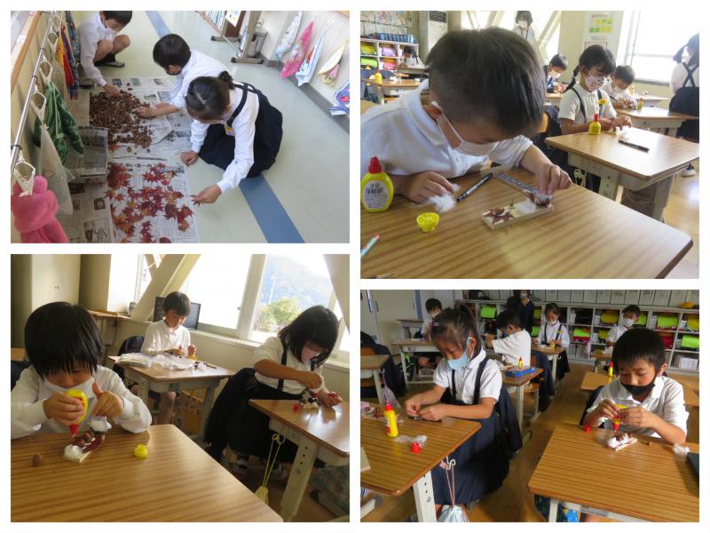 2022年11月11日 16時57分11月11日、快晴。1年生が集中して何かを作っているのでじっくりと見てみると、自分たちで拾ったどんぐりや落ち葉を使って、かわいい飾りを作っていました。かまぼこ板をおうちに見立ててどんぐり兄弟をならべたり、葉っぱの布団やかさのお風呂を貼り付けたりして楽しんでいました。子供たちの発想の豊かさに驚かされます!!