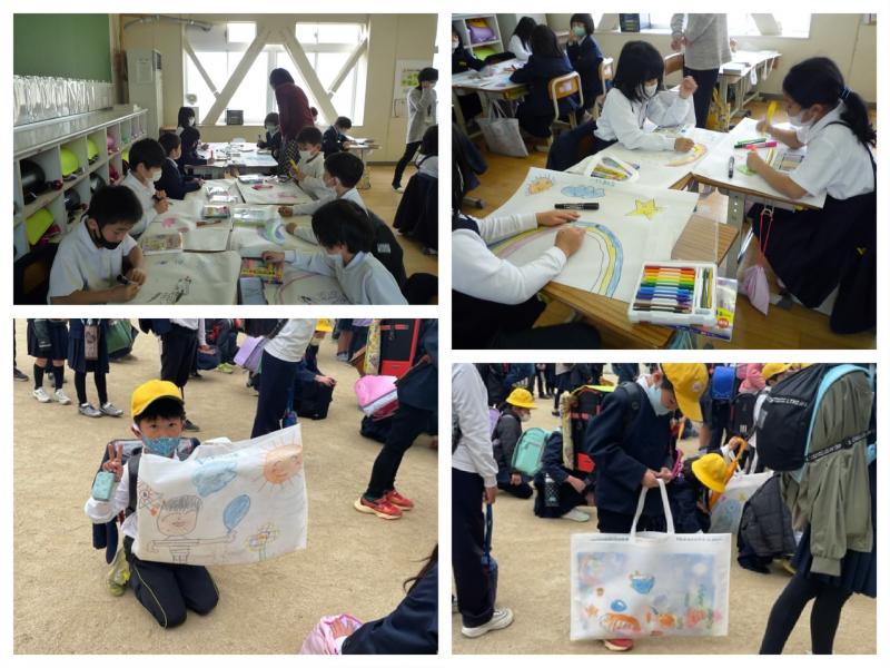 2023年3月10日 07時28分3月9日(木)の3時間目、1年生の教室では、作品持ち帰り用のバッグに絵を描き、オリジナルバッグづくりの真っ最中!それぞれにデザインし、マジック等を使って伸び伸びと描いています。