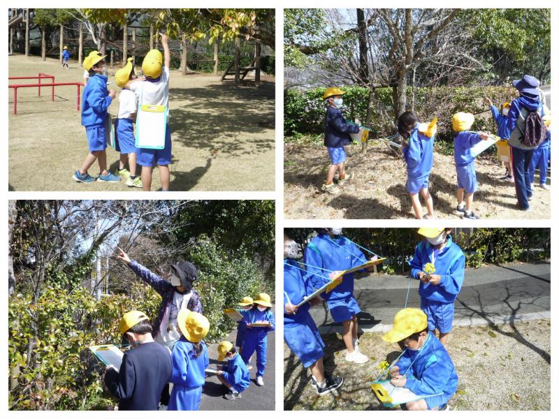 公園に着くと、1年生は早速「春」を見つけにGO!きれいに咲いている椿の花を見つけ、「これは春ですか?」と質問。「椿は冬の花だよ。」との答えを聞くと、今度はいろいろな植物に目を向けます。そのうち、「あっ!なんか木の芽がふくらんどるよ。」と、発見!桜の木を見つけてつぼみの様子を観察したり、少し離れたところにあった菜の花を目ざとく見つけたり・・・。春探しを満喫していました。(*^_^*)