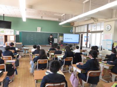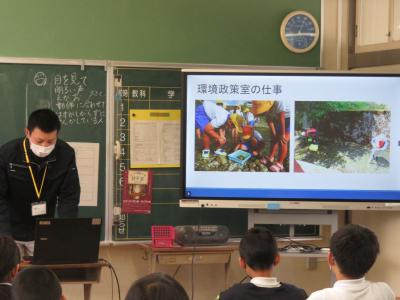 さて、本日の3時間目と4時間目には、総合的な学習の時間に4年生が「内子町の環境」について学習しました。役場の環境政策室の職員さんに来ていただき、内子町の取組について説明していただきました。子供たちは、ゴミの種類で一番多いのが紙ゴミ、2番目がプラスチック、3番目が生ゴミであることや、日本の食品ロスは年間522万トンであること、内子町全体の人口が減ると農業や林業の担い手が減り、結果的に山や田畑が荒れることにつながることなどを学習しました。