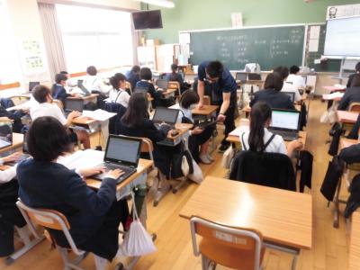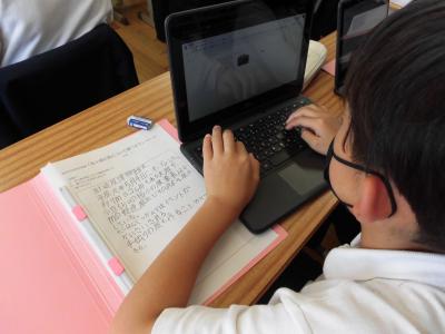 5時間目、6年教室では総合的な学習の時間で、五十崎の大凧合戦について調べ学習をしているところでした。みんな一人一人タブレットをもち、凧の作り方や百畳凧の歴史など、ネットで調べたことを活用しながらパワーポイントにまとめています。タイピングも上手で、両手ですらすらと文字を打っている子供もいました。