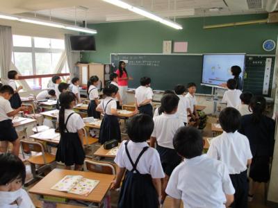 3年生がALTのパトリシア先生と一緒に外国語活動に取り組んでいました。今日は、「What do you like?」をテーマに、教材の聞き取りを行っている場面でした。子供たちの適応力はとても高く、英語の表現を耳でよく聞き取り、自分で一生懸命発音しようとがんばっていました。