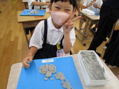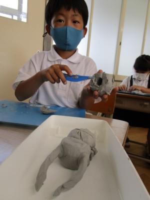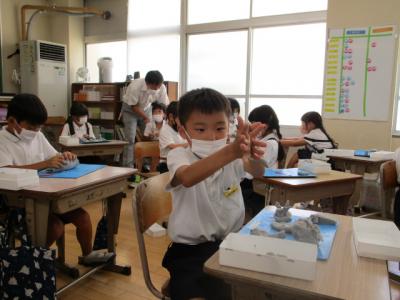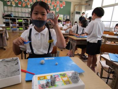 2年生は、粘土を使って造形活動を楽しんでいました。大きな塊から、いろいろな形が生まれていました。中には、とてもリアルな動物を作っている子供もいてびっくりしました。カメラを向けるとにっこりしながら作品を撮らせてくれました。ありがとう。
