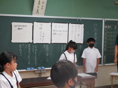 昼休みには、各学年の代表が集まり、代表委員会が行われました。今回は、運動会のテーマを決めることが一番のねらいです。それぞれの学年から自分たちの学級で考えたテーマが発表され、それらをもとに全体で話合いを行いました。天神小学校らしい、やる気に満ちあふれたテーマが決まりました。決まったテーマは、後日、改めて報告いたします。