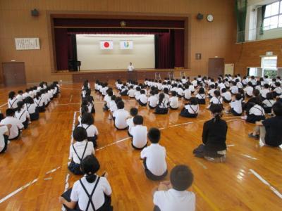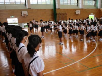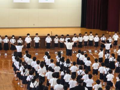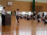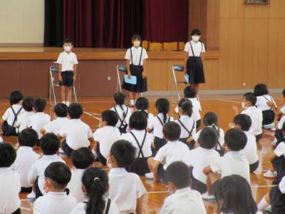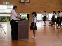 式では、最初に、2年生、4年生、6年生の代表児童が1学期心に残ったことと夏休みのめあてを発表してくれました。楽しかった思い出として、2年生児童は、遠足、ALT・CIRの先生との交流、4年生は、棚田における田植え、内子座の見学、6年生は、修学旅行、水泳の選手になったことなどを発表してくれました。たくさんの行事とさまざまな学習、友達との関わりの中で、みんな一人一人が大きく成長できた1学期でした。